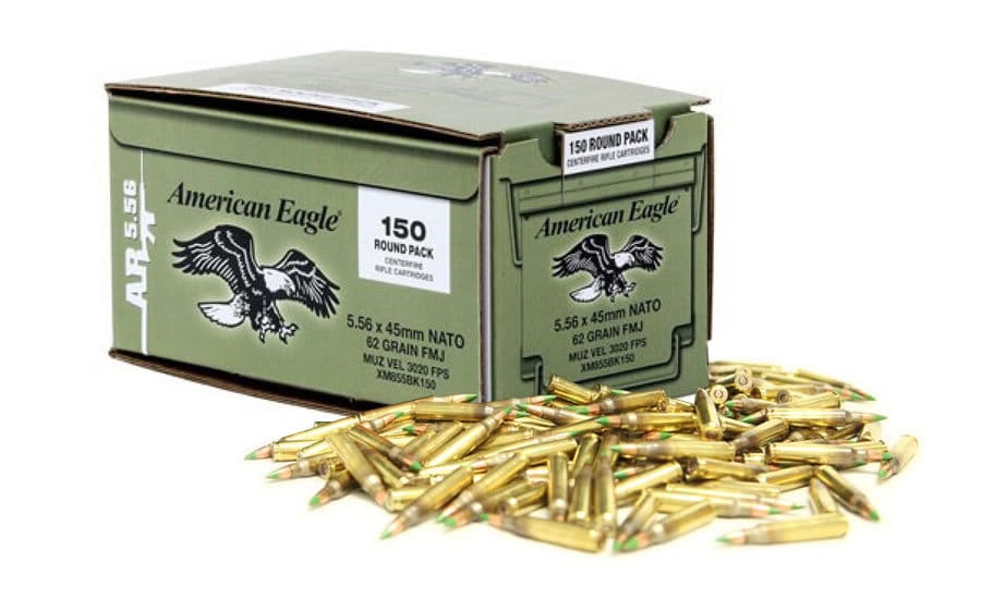Package includes 150 rounds of Lake City XM855 inside a box designed to look like an ammo can. 5.56mm M855 Ball Ammunition has a green bullet tip. Adopted by NATO in 1980, the new load has a spitzer boat-tail bullet. It also has much-improved penetration characteristics over the old M193 55-grain projectile at all ranges, resulting in higher retained velocity and greater accuracy at long range. The 5.56mm M855 is ideal for use in the M16A2 and M4 rifles.