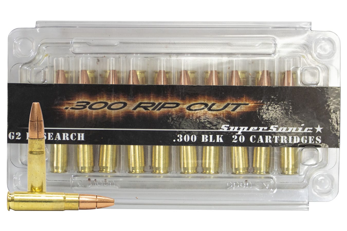 G2 Research (G2R) 300 Blackout Supersonic Ripout Ammunition features a unique one hundred percent copper trocar design which gives it the ability to not only penetrate deep into a target but also fragment in fluid. Upon entering a gel or fluid the 6 trocars break from the base at 2 separate depths creating 6 additional wound channels as the base continues on course. This penetration and separation delivers not only a maximum shock wave but a larger wound path as well.